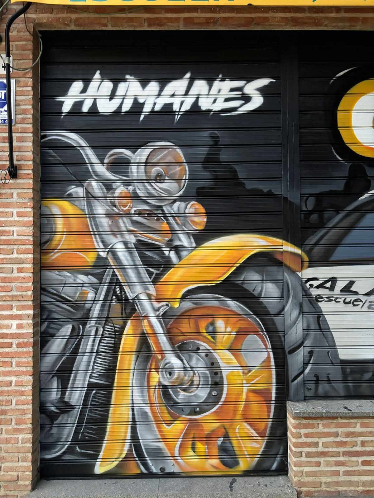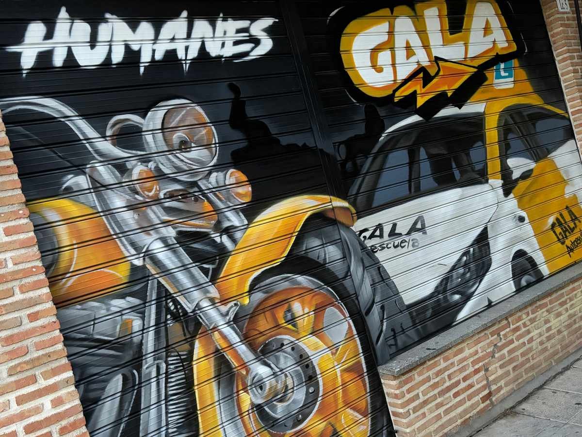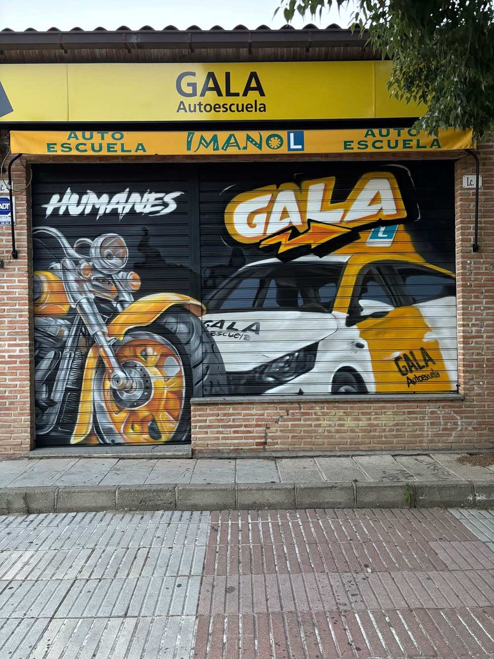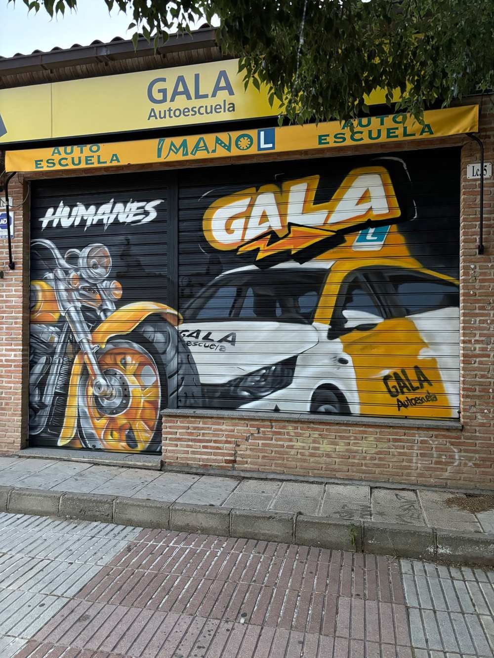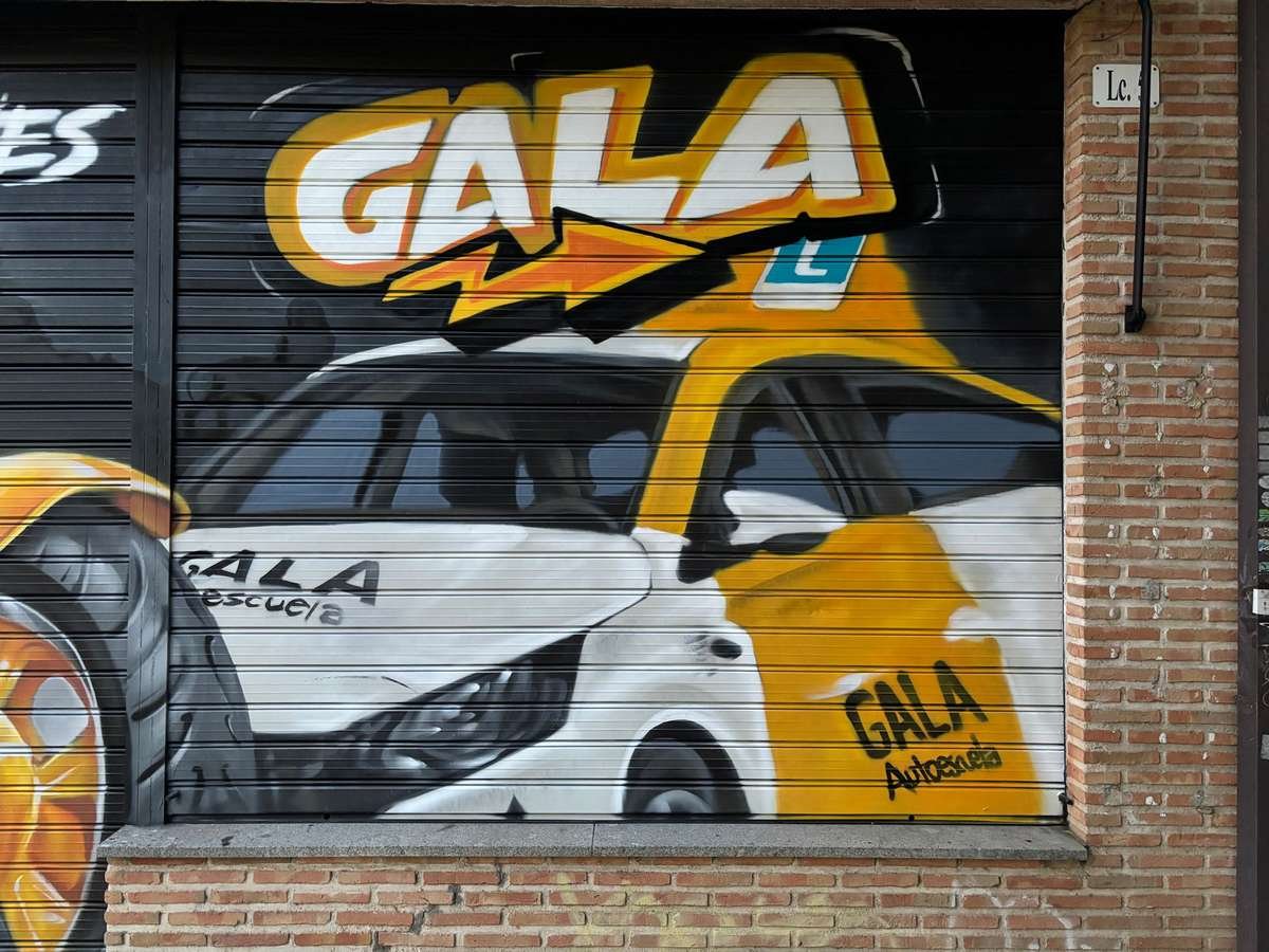Graffiti profesional en la persiana de Autoescuelas Gala, en Humanes. Un diseño llamativo con una motocicleta y un coche de autoescuela integrados en un fondo negro con los colores corporativos, que convierte un cierre metálico en una potente herramienta publicitaria.