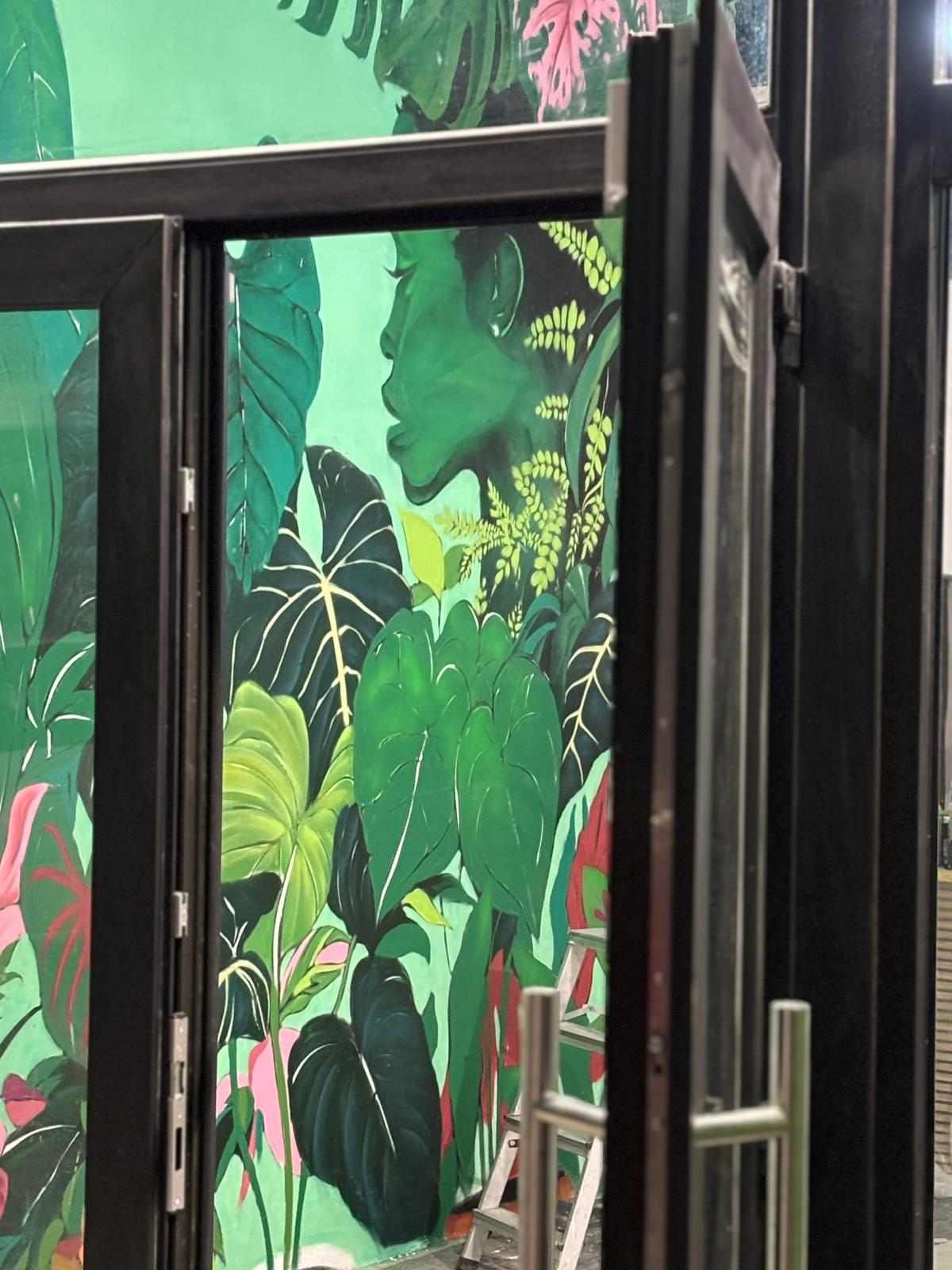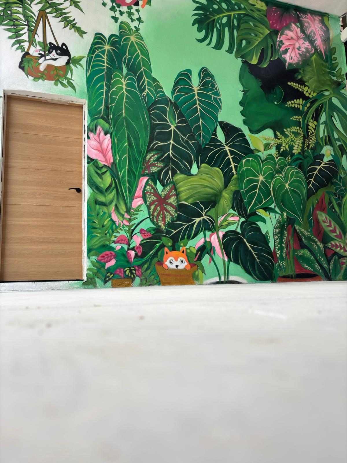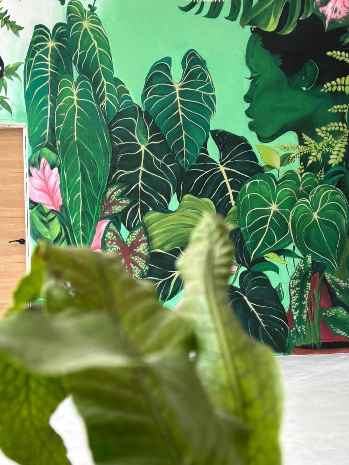 Este mural graffiti en Cantabria, realizado para Plantukas en Torrelavega, transforma el interior de la tienda en una experiencia visual envolvente, fresca y totalmente alineada con su identidad. La composición combina vegetación exuberante, hojas tropicales y una figura integrada en la naturaleza para crear un ambiente atractivo, moderno y lleno de personalidad. No se trata solo de decorar una pared, sino de convertir el espacio en un elemento diferencial que refuerza la marca y mejora la percepción del negocio desde el primer vistazo.