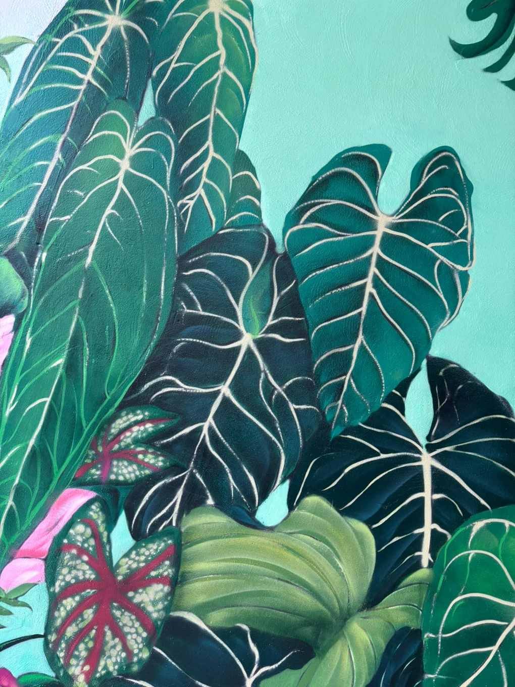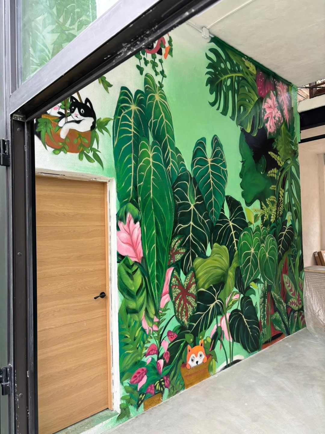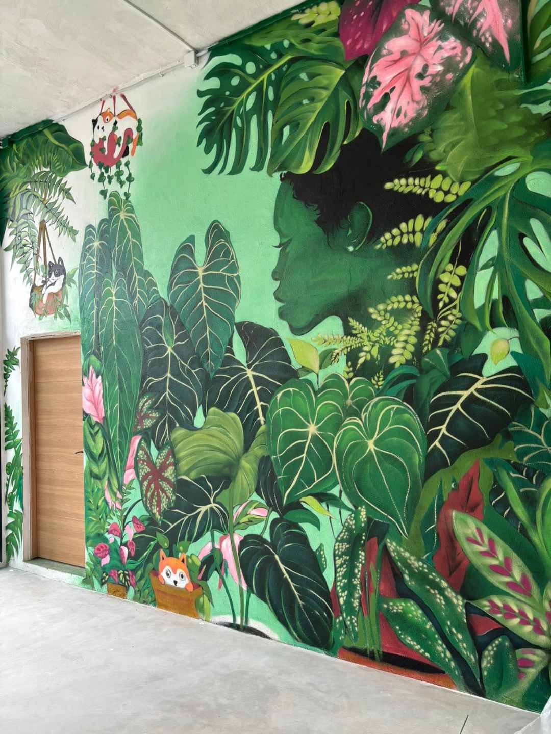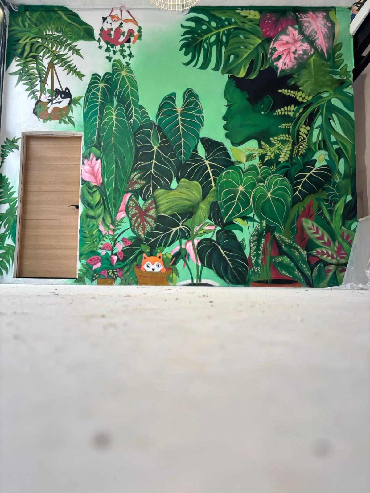 Este mural graffiti en Cantabria, realizado para Plantukas en Torrelavega, transforma el interior de la tienda en una experiencia visual envolvente, fresca y totalmente alineada con su identidad. La composición combina vegetación exuberante, hojas tropicales y una figura integrada en la naturaleza para crear un ambiente atractivo, moderno y lleno de personalidad. No se trata solo de decorar una pared, sino de convertir el espacio en un elemento diferencial que refuerza la marca y mejora la percepción del negocio desde el primer vistazo.