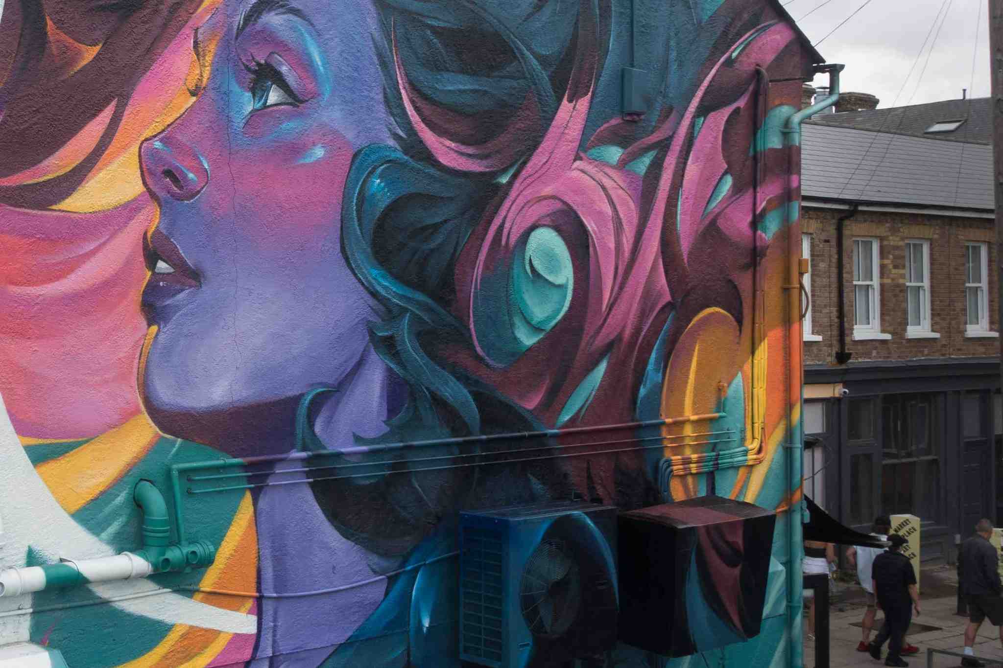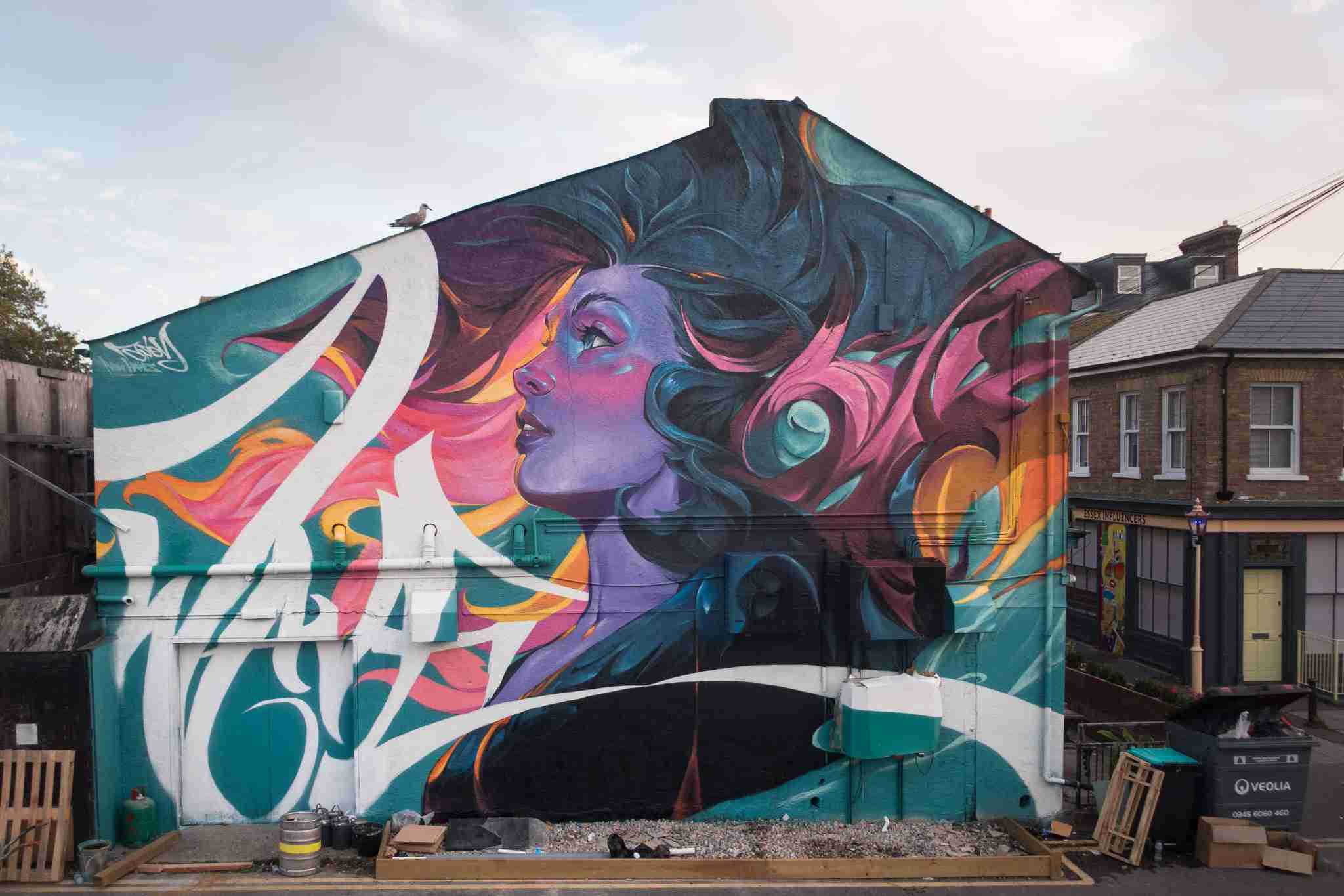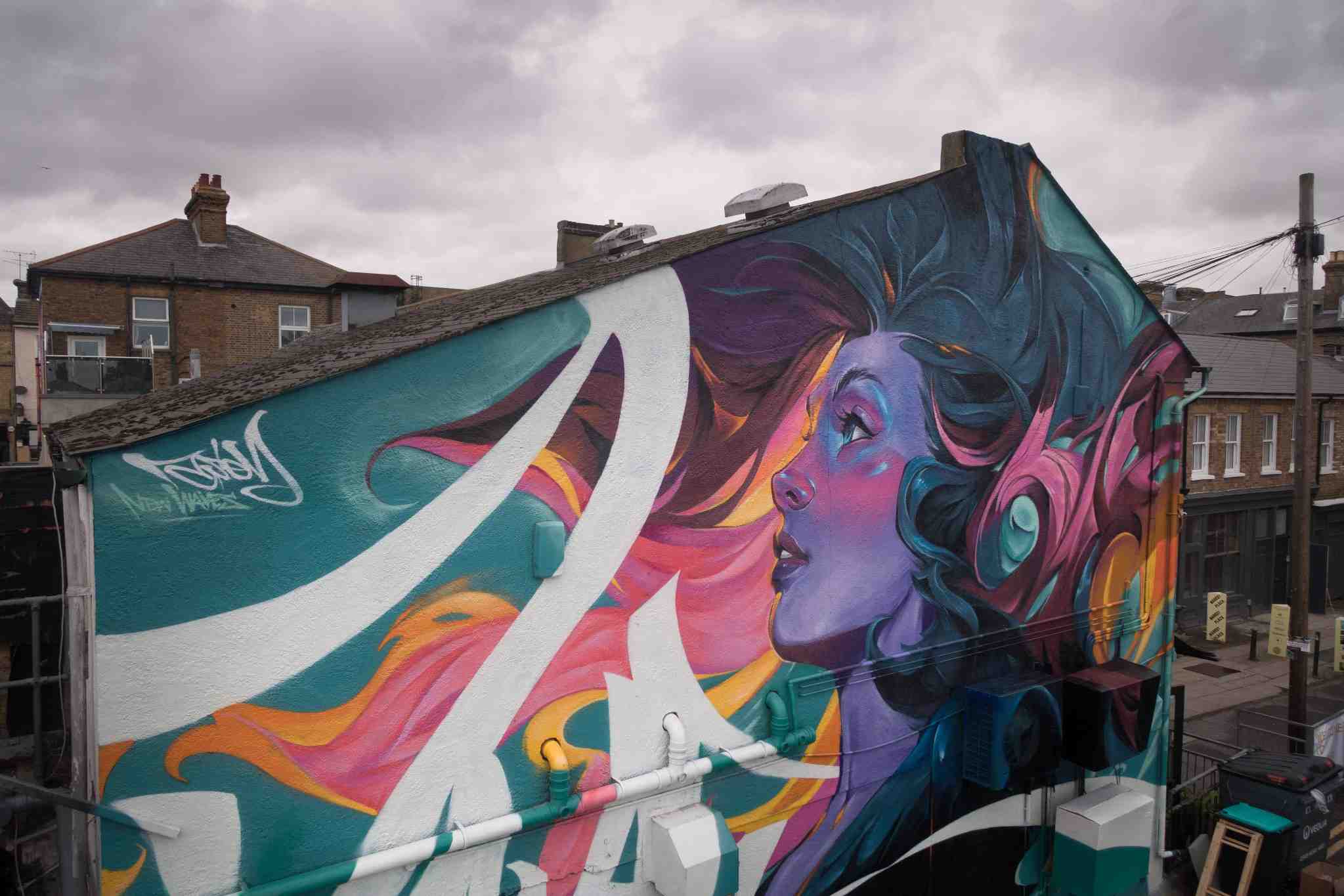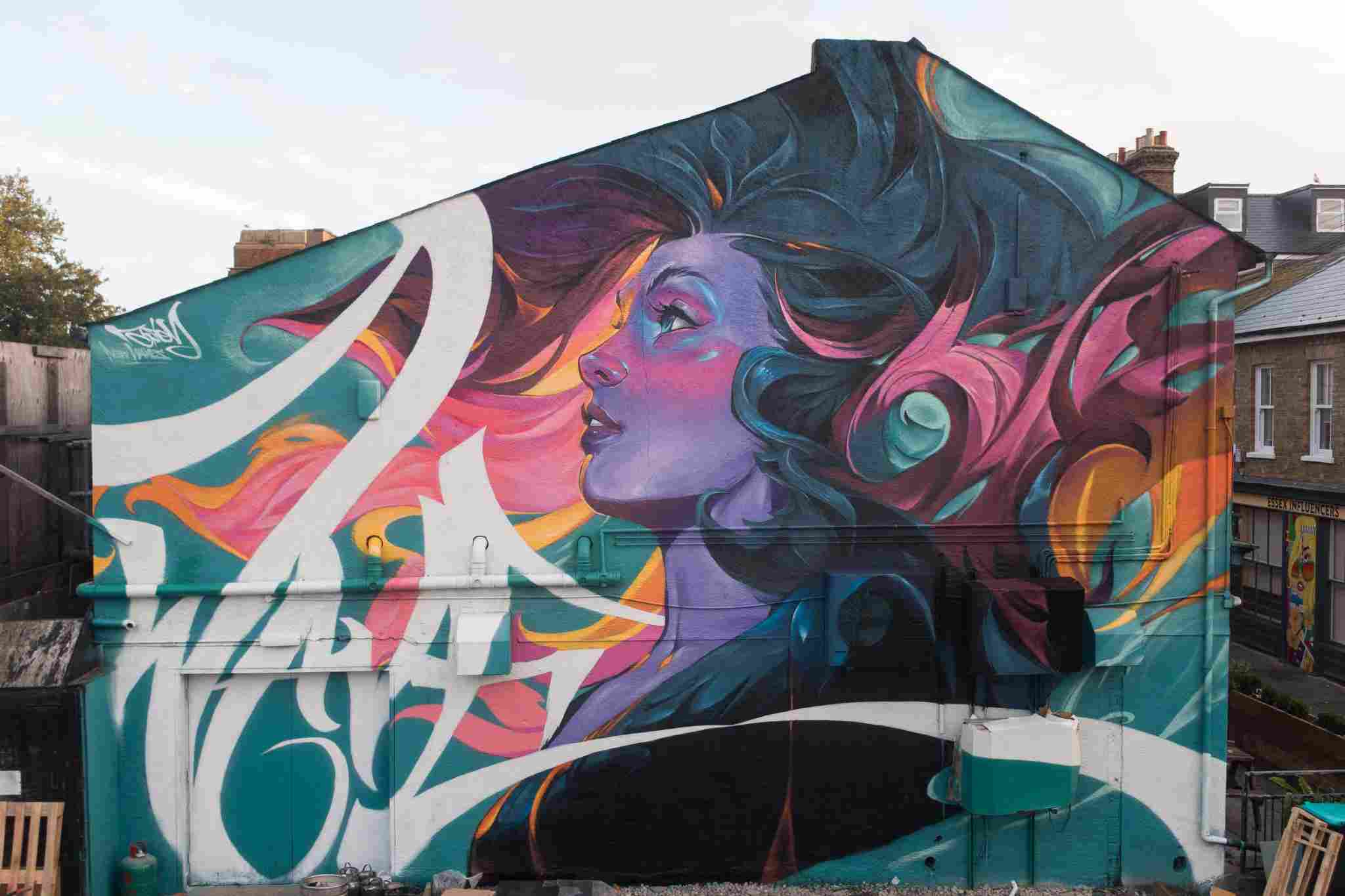 Intervención mural de gran formato en Southend (Londres) para un festival internacional de graffiti. Una pieza vibrante y contemporánea que transforma la fachada lateral de un edificio y dinamiza la calle con color, movimiento y un retrato icónico. Ideal como referencia para ayuntamientos, festivales y marcas que buscan impacto visual, activación urbana y comunicación positiva en espacios públicos.